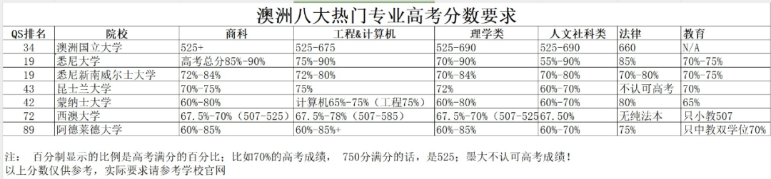 以上是澳洲八大部分热门专业高考分数要求,更多信息私信Monica。